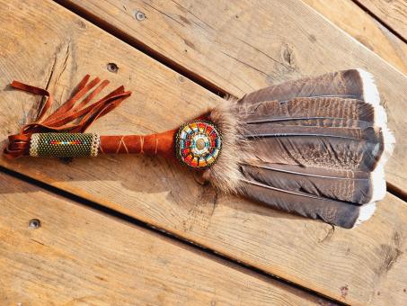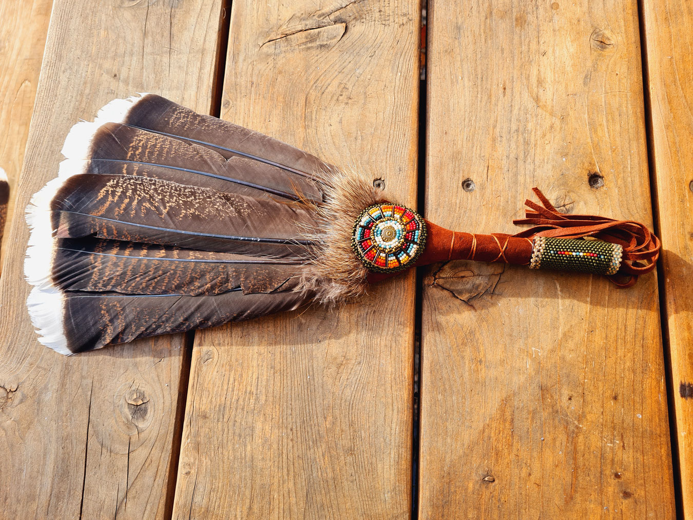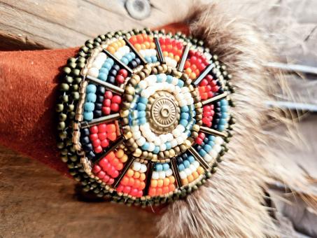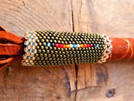 Mit Glasperlenstickereien (Peyote - Stich) werden kraftvolle Ornamente und Symbole, Perle für Perle eingewebt und um den Fächergriff gearbeitet.